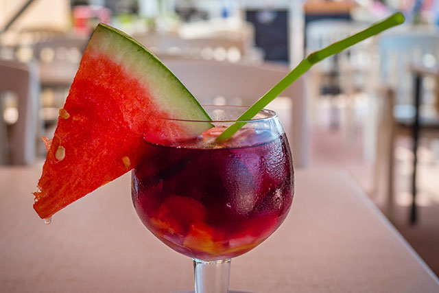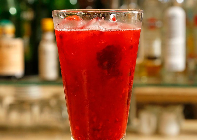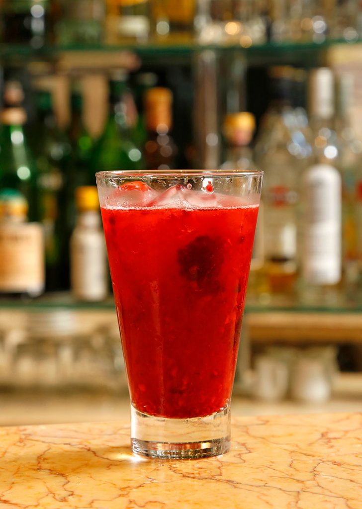 Frutas vermelhas maceradas, açúcar, água com gás e gelo / Red fruits, sugar, sparkling water and ice.
