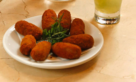 Bolinho de arroz italiano cremoso, recheado de queijo, empanado e frito. Acompanha molho de tomate levemente picante. (4 unidades) / Creamy rice ball, stuffed with cheese, accompanied by slightly spicy tomate sauce. Alergênicos: Leite, glúten e ovos Vegetariano